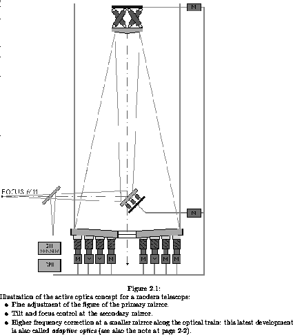 The recent development of active mirror support systems, generally called active optics [Wilson 87], has changed this situation. These systems are mainly aimed at maintaining the shape of the mirror through the change of gravity orientation during tracking and can also correct slight alignment and focusing errors. As the shape of the mirror can be adjusted very finely by active actuators that apply controlled forces, the mirror itself does not need to be very rigid. Moreover a too high stiffness would require higher control forces.